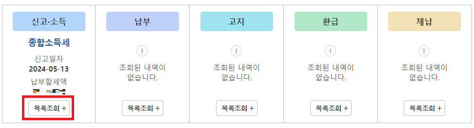 이후에는 위 사진처럼 맨 좌측에 있는 '종합소득세' 칸에 있는 '목록조회' 버튼을 눌러줍니다.