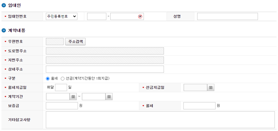 화면에 나와있는 대로 임대인의 주민등록번호, 이름, 월세 살고 있는 주소, 월세 금액 등 계약서의 내용을 적으면 됩니다.