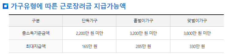 따라서 홑벌이나 맞벌이 분들은 1년 내내 일했어도 근로장려금 대상자일 가능성이 있지만, 혼자 지내시는 분이라면 거의 대상자가 아닙니다.